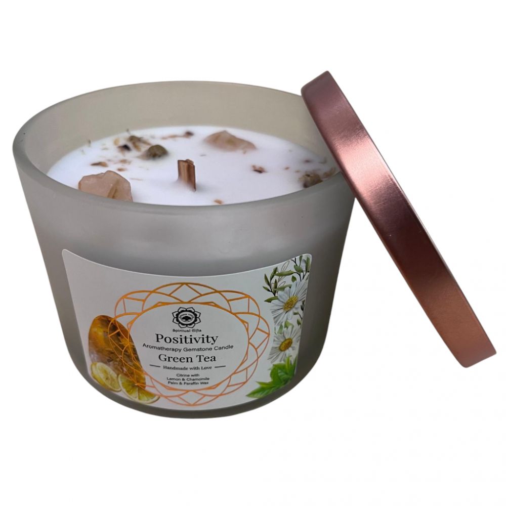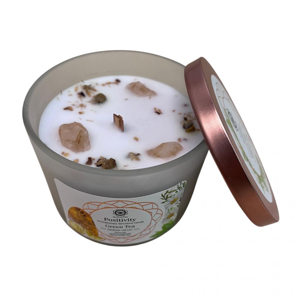 La bougie Green Tree POSITIVITY (Positivité) à la Citrine et au Thé Vert est conçue pour encourager la joie, la clarté mentale et l’énergie positive. La Citrine, pierre de lumière et de prospérité, aide à attirer des énergies positives, stimuler la créativité et renforcer la confiance en soi. Le parfum frais et vivifiant du Thé Vert complète cette bougie en apportant une sensation de bien-être, de légèreté et de renouveau. Ensemble, la Citrine et le Thé Vert créent une ambiance énergisante et équilibrée, idéale pour attirer la positivité, stimuler la motivation et favoriser une humeur joyeuse et optimiste.