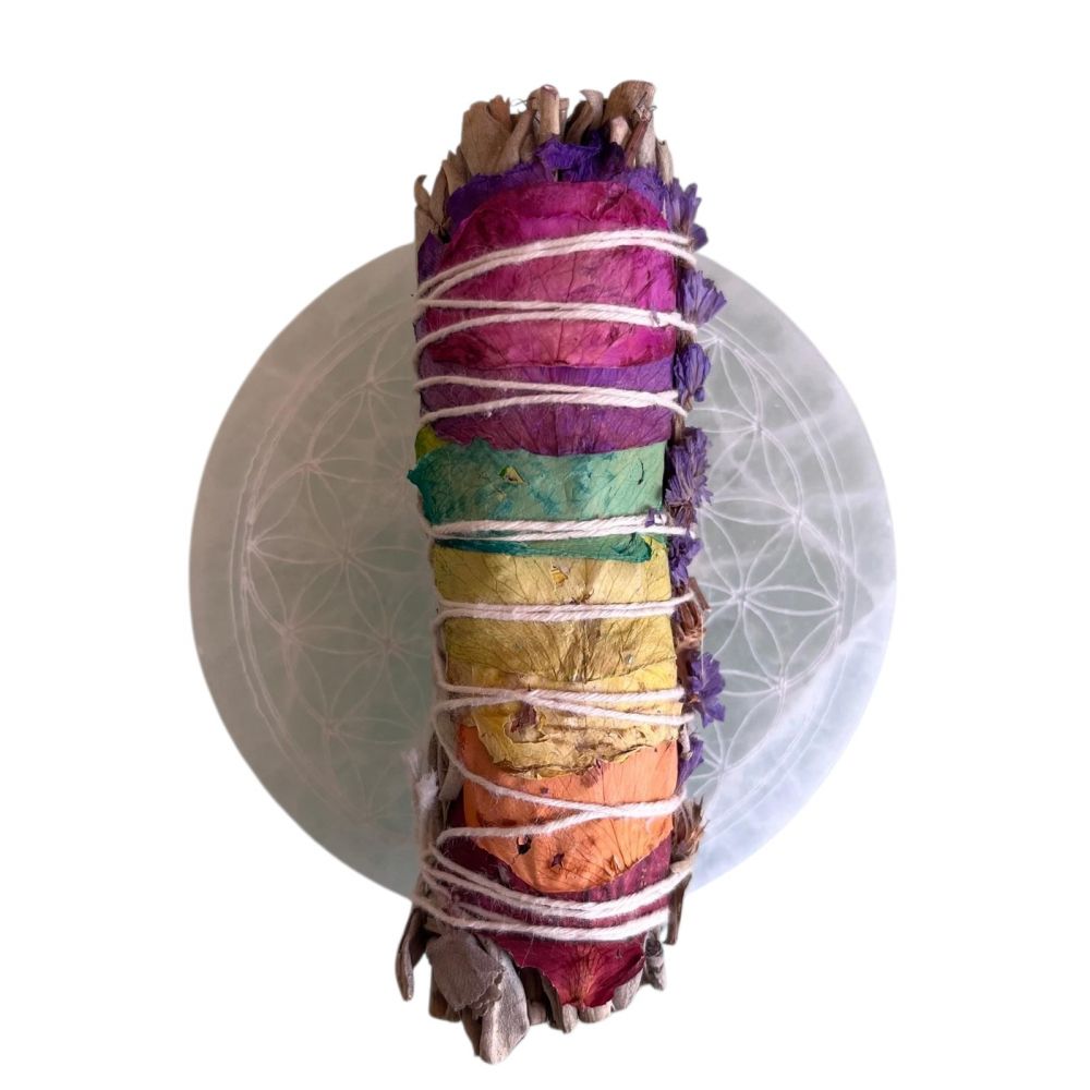 Ce bâton de sauge blanche décoré de pétales de roses colorées dont chaque couleur représentant l’un des sept chakras du corps humain, est une combinaison symbolique pour purifier et harmoniser les énergies des chakras, favorisant ainsi votre équilibre physique et spirituel.