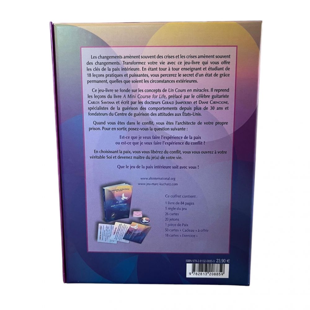 Le jeu de la paix intérieure est un jeu de cartes conçu pour aider à cultiver la sérénité, l’équilibre et la tranquillité d esprit. À travers des messages apaisants, des affirmations et des exercices pratiques, chaque carte invite à la réflexion et à la relaxation, permettant ainsi de trouver la paix au quotidien. Ce jeu est un véritable outil de bien-être pour se recentrer, réduire le stress et nourrir l’harmonie intérieure. Un compagnon idéal pour ceux qui souhaitent créer un espace de calme et de sérénité dans leur vie.