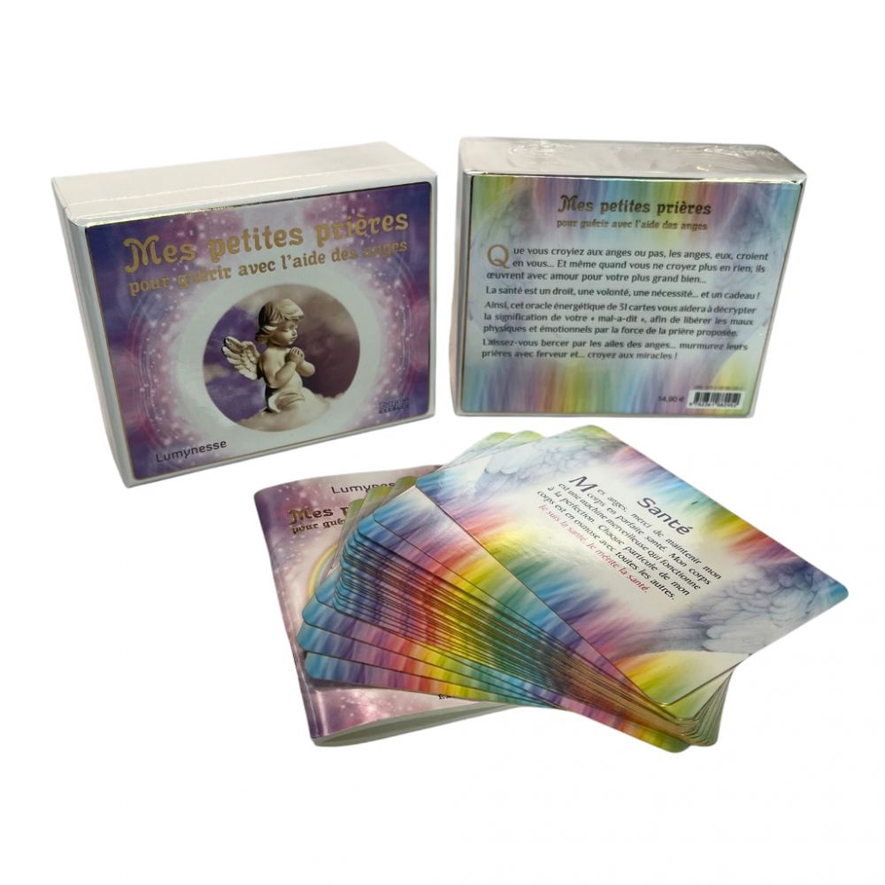 Mes petites prières pour guérir avec l’aide des anges est un jeu de cartes doux et apaisant, conçu pour apporter réconfort et guérison. Chaque carte propose une prière inspirante, accompagnée d’un message d’amour et de protection des anges, afin d’aider à surmonter les épreuves et à retrouver la paix intérieur. Ce jeu est un véritable outil spirituel pour ce connecter à la bienveillance des anges, recevoir des guidances et cultiver un état d’harmonie et de guérison, au quotidien. Un compagnon idéal pour ceux qui cherchent à se ressourcer et à guérir en toute sérénité.