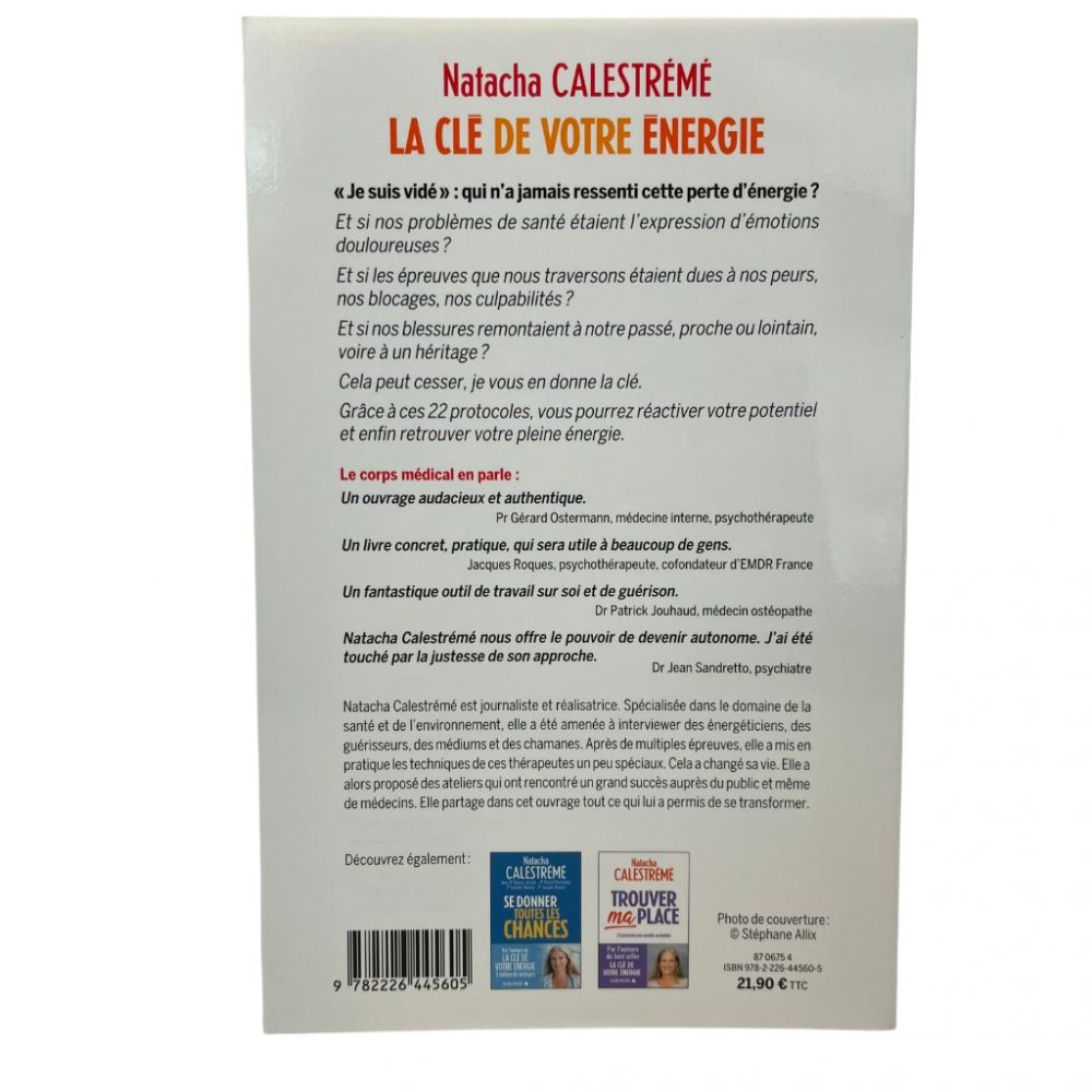 La clé de votre énergie : 22 protocoles pour vous libérer émotionnellement de Natacha Calestrémé propose une série de 22 protocoles pratiques pour aider à libérer les blocages émotionnels et rétablir l’équilibre énergétique. En utilisant des techniques variées, comme la respiration, la visualisation et des rituels, l’autrice guide le lecteur vers une guérison intérieure en travaillant sur les émotions négatives, les croyances limitantes et les traumatismes. Le livre aide à retrouver une énergie positive, améliorer la confiance en soi et favoriser un bien-être durable tout en offrant des outils pour mieux se comprendre et se libérer des poids émotionnels du passé.