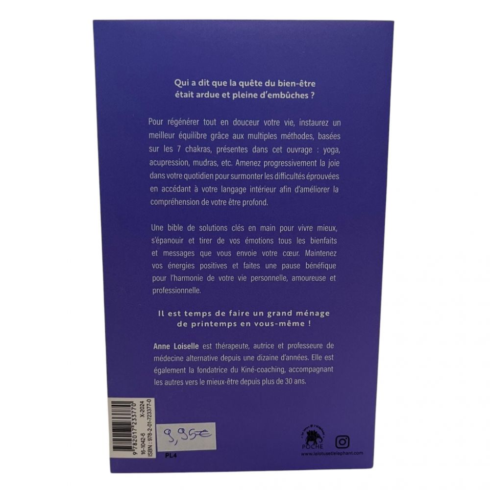 Le grand livre de la détox émotionnelle d’Anne Loiselle est un guide pratique pour se libérer des charges émotionnelles et retrouver un équilibre intérieur grâce aux Chakras. L’auteure propose des outils concrets comme des exercices, des techniques de respiration et des rituels pour identifier, comprendre et apaiser les émotions négatives. Ce livre encourage une approche douce et bienveillante pour transformer les blessures émotionnelles en force et sérénité, offrant un chemin vers une vie plus harmonieuse.
