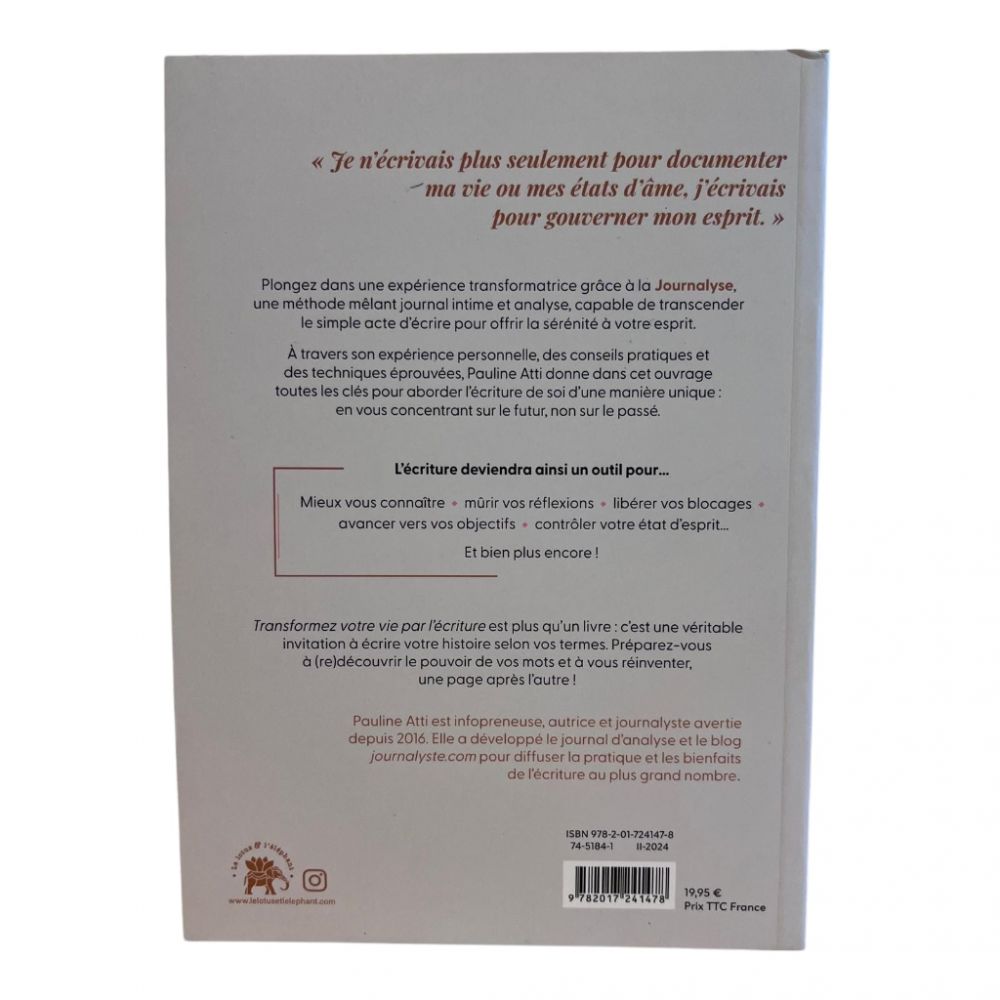 Transformez votre vie par l’écriture de Pauline Atti est un livre qui propose l’écriture comme un outil puissant de développement personnel et de transformation intérieure. L’auteure guide le lecteur à travers des exercices pratiques et des techniques d’écriture créative pour libérer les émotions, clarifier les pensées et créer un changement positif dans sa vie. Ce livre met en lumière comment l’écriture peut être utilisée pour guérir les blessures émotionnelles, explorer ses aspirations profondes et améliorer sa relation avec soi-même. Un ouvrage inspirant pour ceux qui cherchent à utiliser l’écriture comme une voie vers l’épanouissement et la prise de pouvoir sur leur vie.