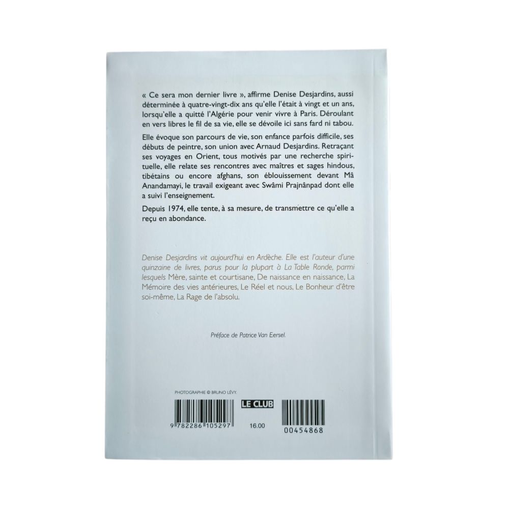 « Ce sera mon dernier livre », affirme Denise Desjardins, aussi déterminée à quatre-vingt-dix ans qu’elle l’était à vingt et un ans, lorsqu’elle a quitté l’Algérie pour venir vivre à Paris. Déroulant en vers libres le fil de sa vie, elle se dévoile ici sans fard ni tabou.