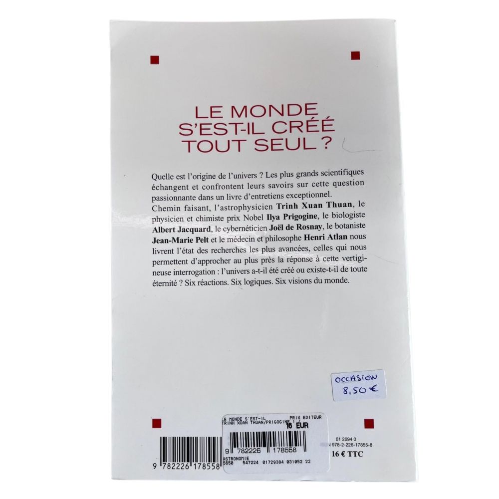 Le monde s’est-il créé tout seul ? est un ouvrage qui aborde la question fondamentale de l’origine de l’univers et de la vie à travers une réflexion philosophique, scientifique et biologique … Les plus grands scientifiques échangent et confrontent leurs savoirs sur cette question passionnante dans un livre d’entretiens exceptionnel.