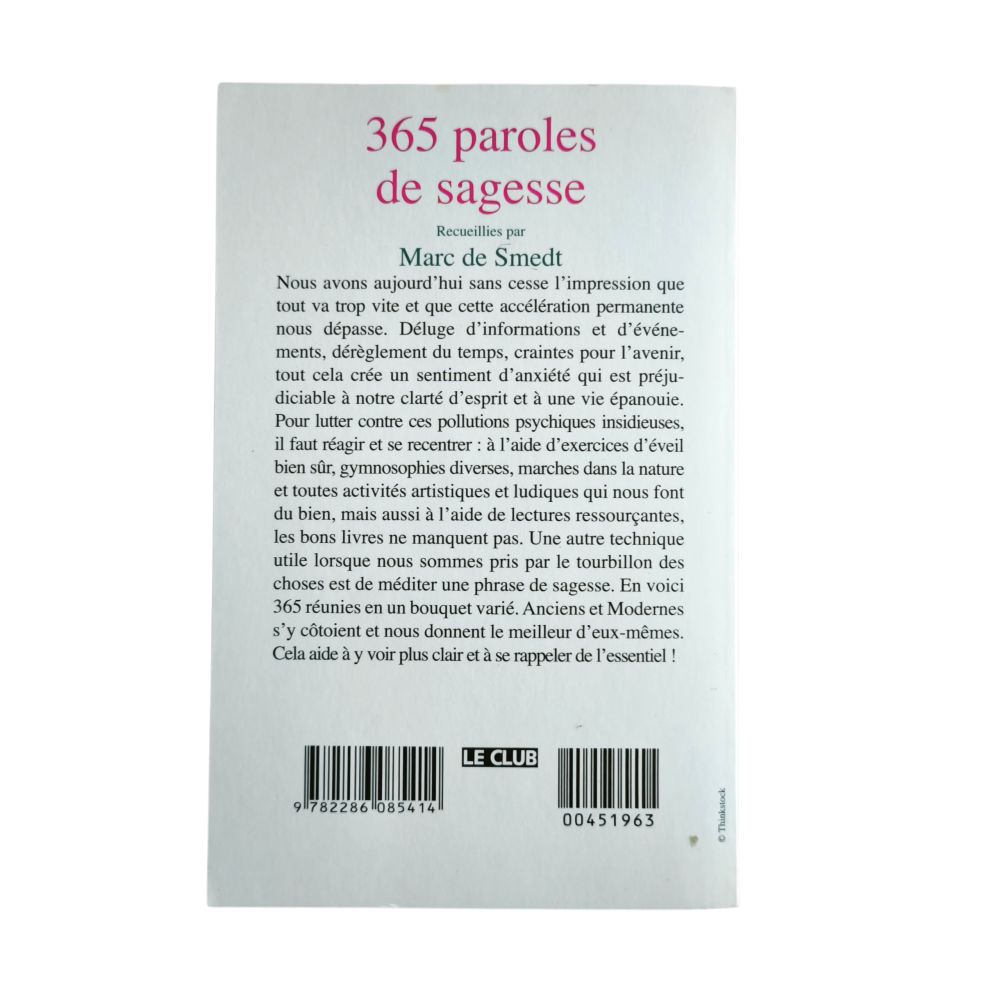 Pour lutter contre ces pollutions psychiques insidieuses, il faut réagir et se recentrer : à l’aide d’exercices d’éveil bien sûr, gymnosophies diverses, marches dans la nature et toutes activités artistiques et ludiques qui nous font du bien, mais aussi à l’aide de lectures ressourçantes, les bons livres ne manquent pas. Une autre technique utile lorsque nous sommes pris par le tourbillon des choses est de méditer une phrase de sagesse. En voici 365 réunies en un bouquet varié. Anciens et Modernes s’y côtoient et nous donnent le meilleur d’eux-mêmes.