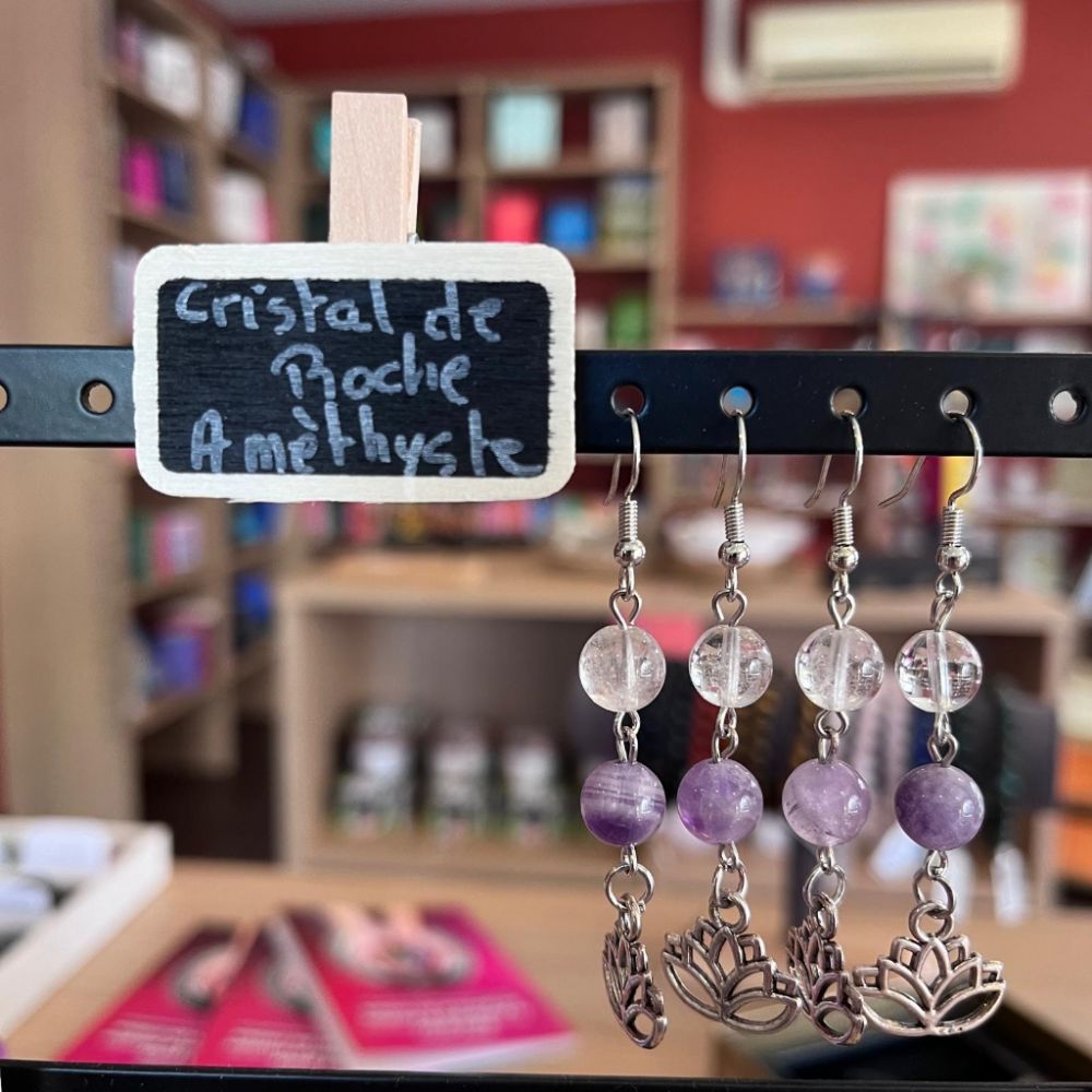 Boucles d’oreilles – Cristal de Roche / Améthyste – lotus