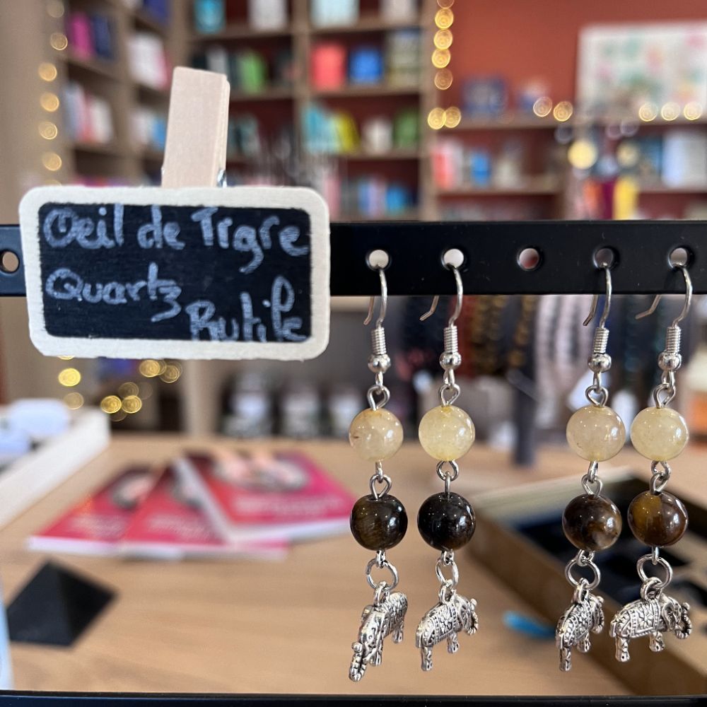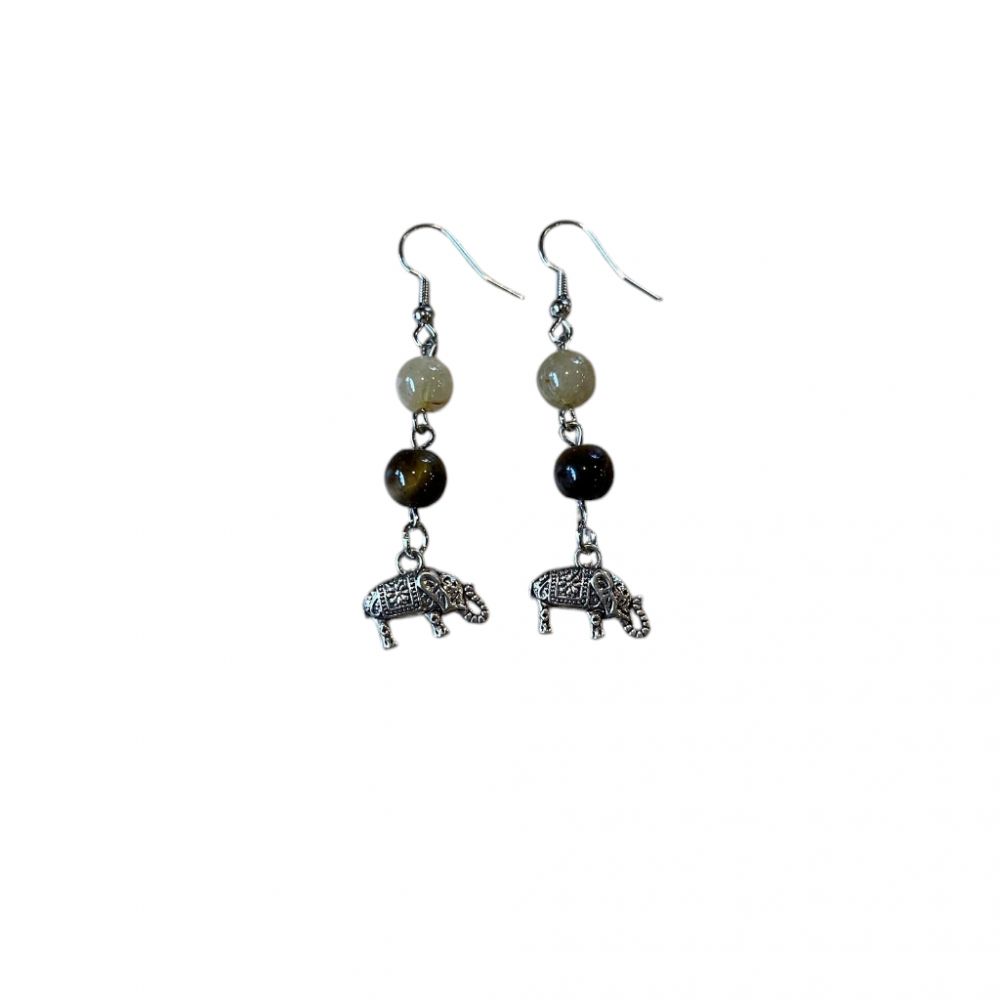 Boucles d’oreilles – œil de tigre/ quartz rutile – éléphant