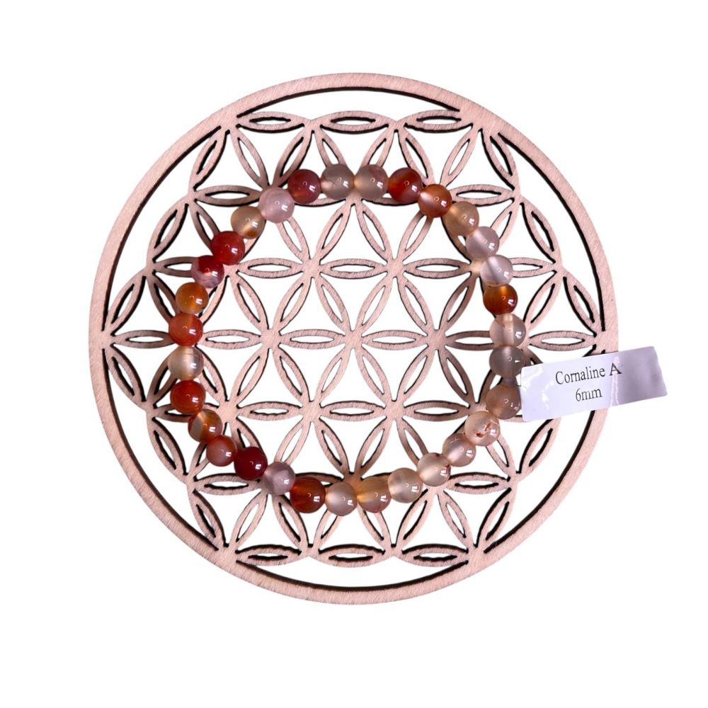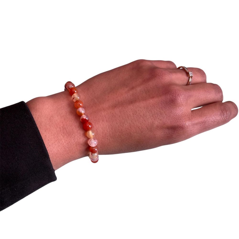 Le bracelet en cornaline, composé de perles de 6 mm de diamètre, est un accessoire à la fois esthétique et bénéfique. Monté sur un fil élastique, il s’ajuste aisément à la plupart des poignets.